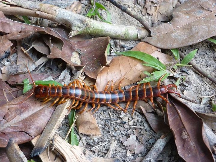 Well armoured, fast, a painful (but not deadly) poisonous bite and growing up to 30 centimetres (12 inches) in length the Giant Centipede is a top predators of the forest floor. It's the first thing we check our clothes and hammock for before sleeping and when waking up. As Painful at its bite might be, the pay only last for several hours. Bites are very rare and just like any other animal it will prefer to avoid conflict and prefers to uses its many feet to get out of the way as fast as possible.
